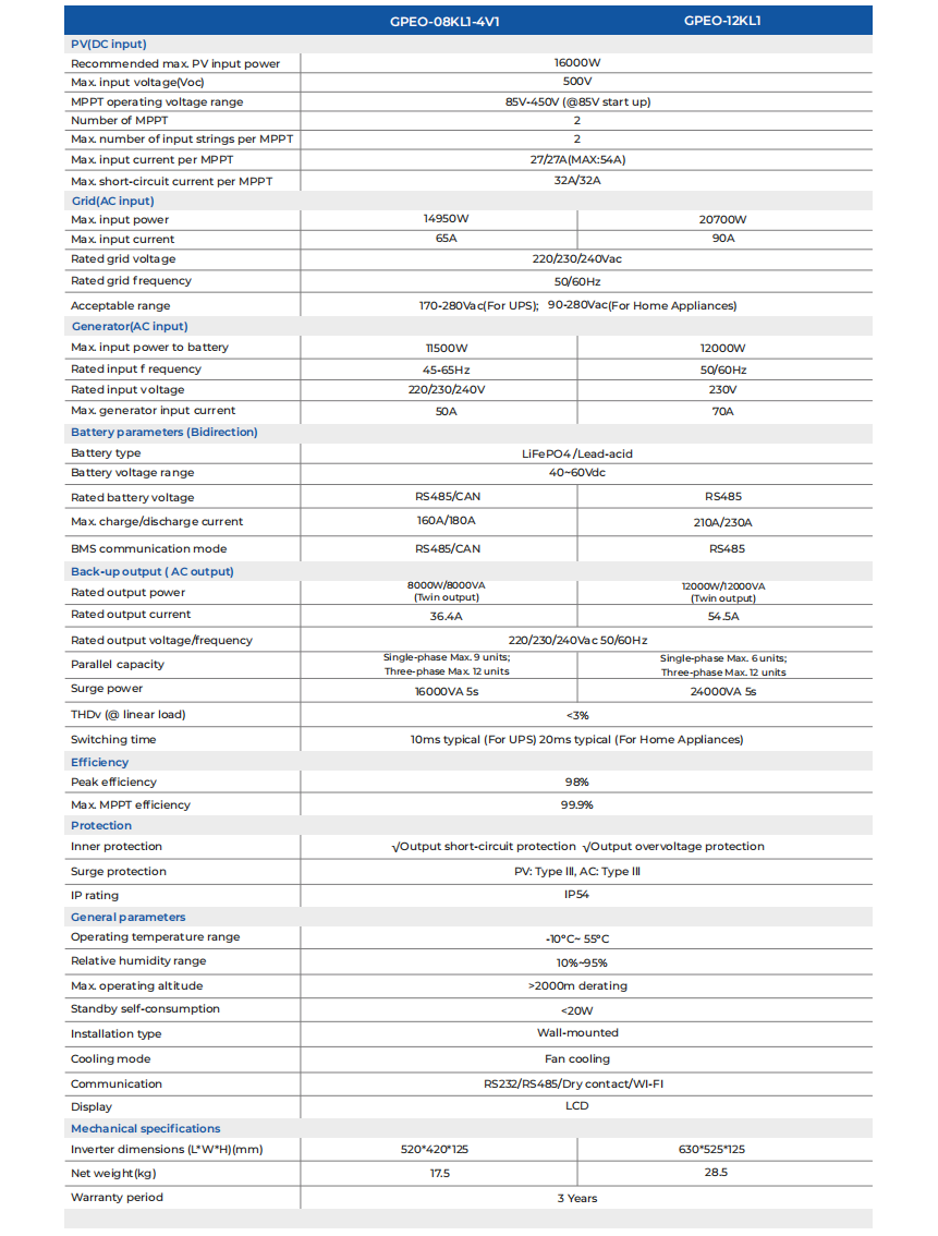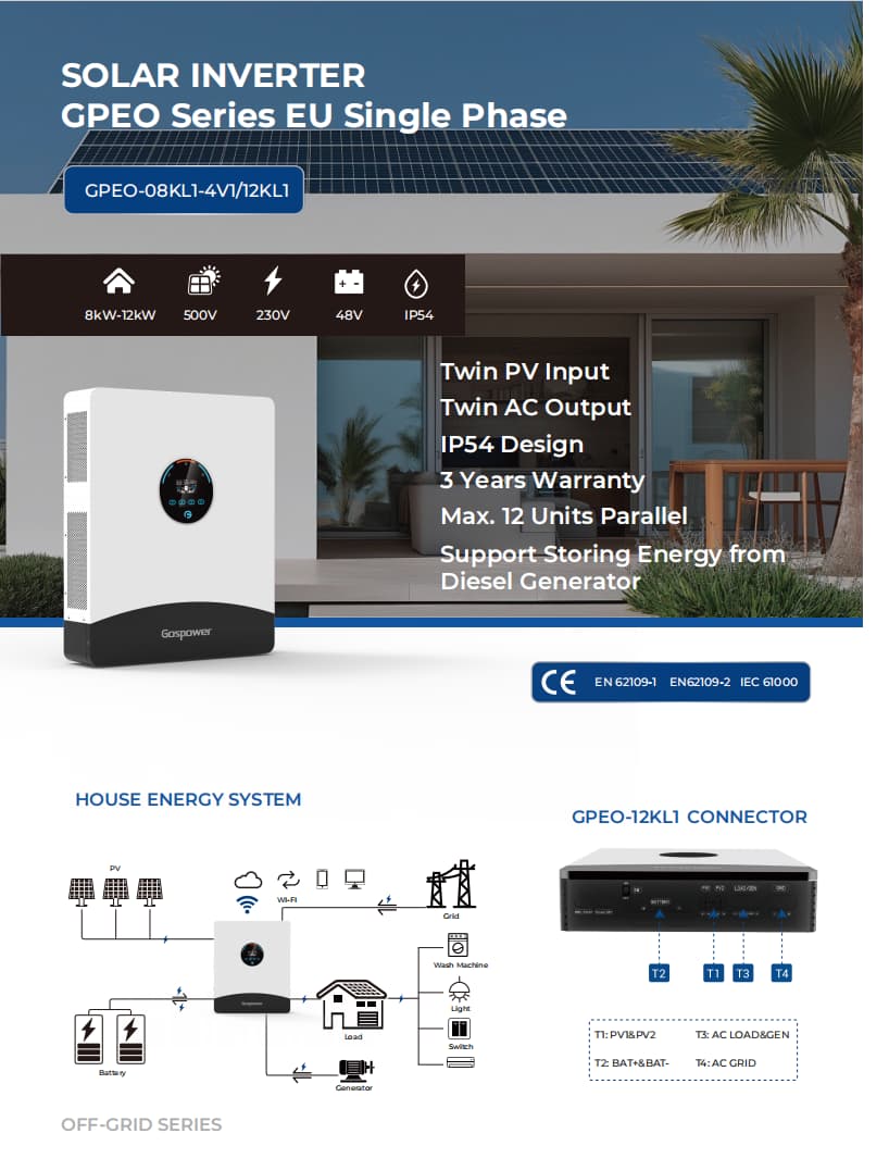 The Gospower GPE0-08KL1-4V1 pure sine wave solar inverter integrates with built-in BMS communication, the inverter enables seamless monitoring and management of battery performance. Capable of parallel operation with up to 12 units, it offers scalability to meet growing energy demands. Backed by 3-year warranty, users can trust in its durability and longevity.